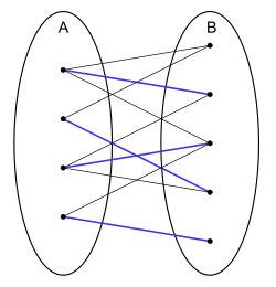 Der Heiratssatz von Hall lässt sich wie folgt graphentheoretisch darstellen. Es sei ein bipartiter Graph mit Bipartition . Ein Matching ist eine Menge von verschiedenen Kanten, die keine Knoten des Graphen gemeinsam haben. Für eine Teilmenge sei die Menge aller zu benachbarten Punkte, die wegen der Bipartitheit notwendigerweise eine Teilmenge von sind. Die Frage nach einem Matching, in dem alle Knoten vorkommen, ist die Frage nach einer Auswahl von paarweise verschiedenen Knoten für alle . Der Heiratssatz lautet in diesem Kontext:[8]
