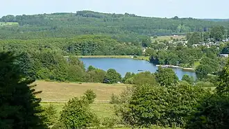 | Der Heisterberger Weiher (mit dem Rother Berg im Hintergrund) • Blick aus Westnordwest von Heisterberg aus | ||