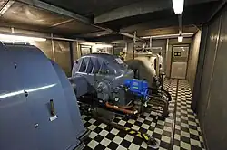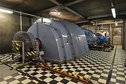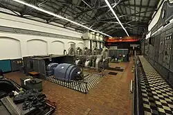 1928: Um die Drehstromumstellung der Anlagen weiter fortzuführen, wurden die beiden 1.000-kW-Gleichstromgeneratoren der MAN-Turbine aus dem Jahre 1914 gegen einen neuen Thyssen-Drehstromgenerator mit 2.000 kW bei 5.000 Volt Spannung ausgetauscht. Gleichzeitig wurden von der Fa. BBC neue Schaltanlagen, mit Fernsteuerung aus der Maschinenhalle, in angrenzende Gebäudeteilen aufgebaut (die zugehörige Schalttafel und die Turbine mit dem Thyssen-Generator sind heute noch in der Maschinenhalle zu besichtigen).