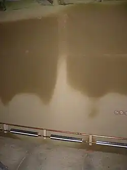 Das Foto zeigt wie der frisch aufgebrachte Lehmputz durch die seit drei Tagen laufende Fußleistenheizung allmählich von unten her austrocknet. An der helleren Farbe sind die unter dem Putz liegenden Fachwerkbalken zu erkennen, da die Putzschicht hier dünner ist und schneller austrocknet.[1]