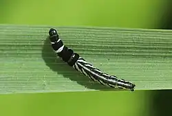 Die bis zu 10 mm langen Raupen sind im vorderen Bereich überwiegend schwarz gefärbt, im hinteren überwiegend weiß gefärbt. Kopf und Nackenschild sind schwarz. Die Segmente 3–6 sind schwarz, wobei die Segmente 3 und 4 vorne weiß gesäumt sind. Das sechste Segment weist dorsal einen braunen Fleck auf. Über die hinteren Segmente verläuft dorsal mittig ein weißer Längsstrich, flankiert beiderseits von einer dunklen Subdorsallinie, von der eine Reihe schräg nach hinten gerichteter dunkler Striche abzweigt. Mit diesem Färbungsmuster lassen sich die Raupen gewöhnlich sicher bestimmen. Es gibt jedoch ähnlich gefärbte Raupen verwandter Arten.