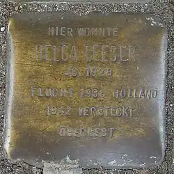 Helga Leeser wurde 1928 in Münster als ältestes von zwei Kindern in eine wohlhabende, jüdische Familie geboren, welche jedoch nicht religiös lebte. Schon früh zog sie mit ihrer Schwester und ihren Eltern nach Dülmen. Ihre Familie besaß dort eine Leinenfabrik. Bevor ihre Mutter 1927 Helgas viel älteren Vater heiratete, war ihre Mutter niederländische Staatsbürgerin gewesen. Ab dem Jahr 1933 besuchte sie eine katholische Grundschule. Während der Reichspogromnacht 1938 wurde das Haus der Familie Leeser zerstört, ihr Vater wurde verhaftet und beging vier Tage später in seiner Gefängniszelle Suizid. Helgas Mutter erlangte ihre niederländische Staatsbürgerschaft zurück und wanderte in die Niederlande aus. Mit der Hilfe ihres Großvaters schlossen sich Helga und ihre Schwester ihr an. Nachdem der NS-Staat im Mai 1940 die Niederlande besetzt hatte, durften Juden keine nicht-jüdischen Schulen mehr besuchen – so auch Helga. 1942 entging sie mit ihrer Mutter und ihrer Schwester der Deportation, indem sie sich mit falschen Papieren als niederländische Christen ausgaben und nach Rotterdam zogen, wo ein Ehepaar sie in seiner Wohnung versteckte. Sie wohnten nur zwei Blocks vom Polizeipräsidium entfernt. Nach ihrer Befreiung am Ende des Krieges blieben Helga, ihre Schwester und ihre Mutter in Rotterdam. 1957 heiratete sie Leo Becker. Das Paar bekam zwei Söhne. 2018 starb sie im Alter von 89 Jahren in Arnhem.