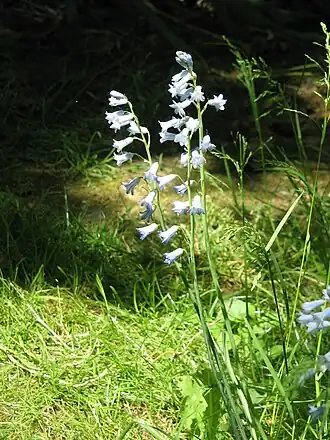 In einem mehr oder weniger einseitswendigen, traubigen Blütenstand sind (selten drei bis) meist sechs bis 18 nickende Blüten angeordnet. Die zwittrigen Blüten sind dreizählig. Die hellblauen, selten auch indigofarbenen oder weißen Blütenhüllblätter weisen eine Länge von 8 bis 11 Millimeter auf und sind zu zwei Dritteln verwachsen. Die sechs Staubblätter stehen in zwei Kreisen und sitzen etwas oberhalb der Mitte der Blütenhüllblätter an. Die Staubbeutel sind gelb.