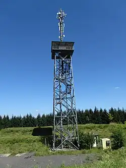 Wenige Meter nordwestlich des Berggipfels wurde 1998[4] der Aussichtsturm Helleberg () erbaut. Von seiner Aussichtsplattform auf 521,3 m[4] Höhe sind bei guten Sichtbedingungen Großteile des Westerwaldes (inkl. Westerwälder Seenplatte) zu sehen, zudem fällt der Blick in Richtung Eifel, Vogelsberg und Taunus. Über der Plattform befinden sich Mobilfunkanlagen sowie eine Wetterstation.