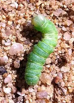 Ausgewachsene Raupen sind von grasgrüner bis bläulich grüner Farbe und zeigen dünne weiße Rücken- und Längslinien und einige ebenso gefärbte, sehr kurze Haare. Der hellgrüne Kopf ist groß.