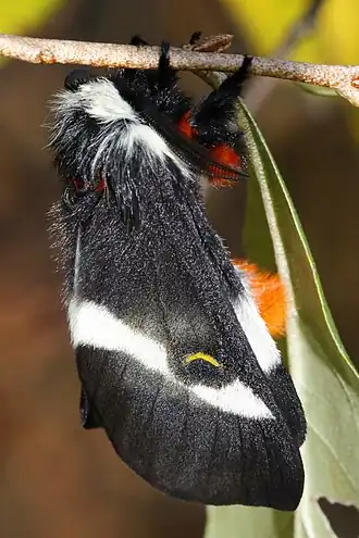 Die Falter erreichen eine Flügelspannweite von 50 bis 75 Millimetern.[1] Die Weibchen sind etwas größer als die Männchen. Die Art zeichnet sich durch einen geringen Sexualdimorphismus aus. Bei beiden Geschlechtern ist die Grundfarbe auf den Flügeloberseiten schwarz. Sämtliche Flügel sind dünn beschuppt. Durch die Diskalregion auf der Vorderflügeloberseite erstreckt sich ein weißes Band, das sich verbreitert auf den Hinterflügeln fortsetzt. Auf Vorder- und Hinterflügeln heben sich halbmondförmige gelbe Diskalflecke ab. Thorax und Abdomen sind pelzig schwarzgrau, der Kopf weißlich behaart. Nur bei den Männchen ist das Hinterleibsende mit buschigen rotbraunen Haaren versehen. Die Fühler der Männchen sind beidseitig gekämmt, diejenigen der Weibchen sind fadenförmig. Ein Saugrüssel fehlt.