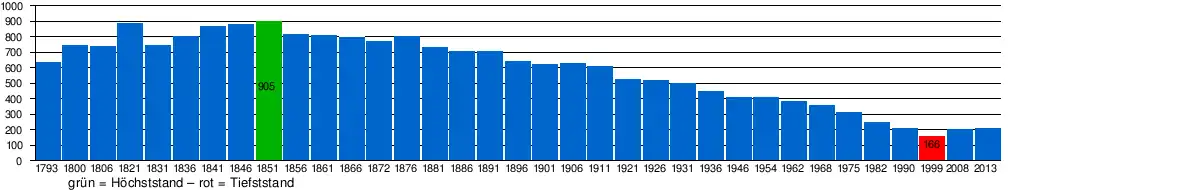 Die ehemalige Gemeinde gehörte nie zu den bevölkerungsreichsten Orten der Region. Dennoch kam es zu einem markanten Wachstumsschub zwischen 1793 und 1821 (1793–1821: + 38,4 %). In den darauf folgenden zehn Jahren kam es zu einer ersten Abwanderungswelle. Eine zweite und letzte Wachstumsperiode dauerte von 1831 bis zum Bevölkerungshöchststand von 1851 (1831–1851: + 20,2 %). Dann begann eine lang anhaltende Zeit der Abwanderung, die erst 1999 gestoppt wurde (1851–1999: - 81,7 %). Nach einem kurzen Wachstumsschub bis 2004 hat sich die Anzahl der Bewohner bei einer Marke von 210 Personen eingependelt.