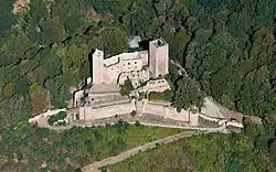 Der am nördlichen Rand der Kernburg stehende, 25 Meter hohe große Bergfried hat eine Grundfläche von 9,8 × 9,8 Metern. In dem aus einer Buckelquaderverbindung bestehenden Bau befindet sich in etwa zehn Metern Höhe der ursprüngliche Eingang, an dem noch die Aussparungen für das Türhaus und die Brücke zum benachbarten westlichen Palas zu sehen sind. Auch das Innere des Turmes ist ähnlich sorgfältig wie das Äußere mit fein bearbeiteten Quadern aufgemauert. Die Bearbeitungsqualität der Buckelquader nimmt jedoch im oberen Bereich des Turmes deutlich ab. Dies lässt auf einen raschen Abschluss der Bauarbeiten durch äußere Zwänge oder auf Geldmangel schließen. Im großen Bergfried sind zwei, über eine komplizierte Gangführung erreichbare Aborte angelegt, die über einen Schacht in der Turmwand und über eine Rinne in den Burggraben entleert wurden.