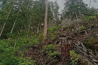 ![]() Blick hinauf auf den Felssporn mit den Südteil der Ringmauer | ||