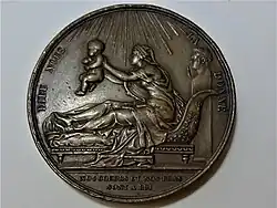 Henri in den Armen seiner Mutter und Büste seines Vaters dahinter auf Medaille auf seine Geburt