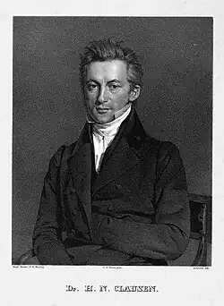 - ↑ Eiríksson sah in Clausen (ganz im Gegensatz zu Grundtvig) einen hervorragenden Repräsentanten der „evangelischen Partei“, deren Christentumsverständnis „der christlichen Wahrheit am nächsten stand“ (Om Baptister og Barnedaab, samt flere Momenter af den kirkelige og speculative Christendom. Kopenhagen 1844, S. VI). Gleichwohl führte die Anhängerschaft Eiríkssons an Clausen nicht zur Übernahme von dessen Vernunftbegriffs, vgl. den Artikel über Magnús Eiríksson.