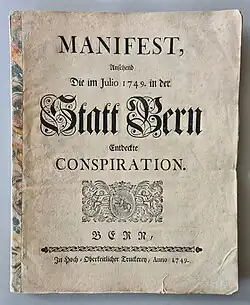 Die bernische Regierung liess ihre Darstellung der Verschwörung samt den ergangenen Urteilen in einer Broschüre unter dem Titel Manifest, ansehend Die im Julio 1749. in der Statt Bern Entdeckte Conspiration drucken und verbreiten.