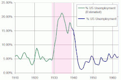 Viele Unternehmen senkten zwar nicht die Löhne, fuhren aber die Produktion zurück und schmälerten so die Gehälter. Der so entstehende Einbruch in der privaten Nachfrage führte in einem Teufelskreis dazu, dass wiederum die Wirtschaft Produktion und Lohnkosten weiter absenkte. Eine Depression setzte ein und vertiefte sich, was unter anderem dazu führte, dass trotz der Vereinbarungen und Zusagen der Konferenz die Arbeitslosenzahl allein in den zehn Tagen vor Weihnachten 1929 um eine Million stieg.[66][133] Zu dieser Zeit lud auf Vorschlag Hoovers die Chamber of Commerce unter Vorsitz von Julius H. Barnes Wirtschaftsverbände zur National Business Survey Conference ein, welche zentrale Geschäftshindernisse entdecken und beheben sollte.[134] Sie beruhte auf freiwilliger Mitarbeit und konnte auf das Fachwissen von 170 teilnehmenden Organisationen zurückgreifen.[131] Die National Business Survey Conference leistete laut dem Historiker Robert S. McElvaine nichts weiter als Optimismus zu verbreiten und stellte sich als ein solcher Fehler heraus, dass sie bereits 1931 aufgelöst und von Hoover, der sie anfangs mit Enthusiasmus begleitet hatte, in seinen späteren, ausführlichen Memoiren nicht erwähnt wurde.[135]