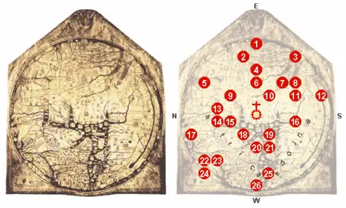 Auch wegen seiner Ausmaße (größer war nur die verlorengegangene, aber 1952 wieder rekonstruierte Ebstorfer Weltkarte) zeigt das Werk mehr geografische Details als andere Radkarten: Indus, Tigris (4) und Euphrat (6) sind dargestellt, der Persische Golf (7) und das (in Rot gemalte) Rote Meer (8), das Tote Meer mit den versunkenen Städten Sodom und Gomorrha (10), in das aus dem See Genezareth der Jordan fließt – darüber Lots Weib, sich umdrehend.