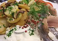 Der Brockhaus definiert Heringsstipp als „Fischmarinade aus mindestens 50 % gesäuertem oder gesalzenem, filetiertem, zerteiltem Heringsfleisch mit Zwiebeln, Gurken, Gewürzen (auch Sellerie) und Mayonnaise, die fein zerriebene Heringsmilch enthalten kann“.[1]