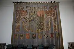 - Maximilianeum (Plenarsaal) Gobelin mit dem Großen Bayerischen Staatswappen und den Wappen der Regierungsstädte Bayerns (seit 2017 dem Haus der bayerischen Geschichte in Regensburg zur Verfügung gestellt)