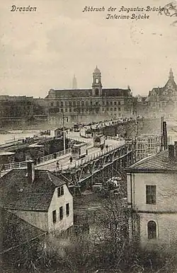 Nach dem Vorbild der Augustusbrücke am anderen Ende der Brühlschen Terrasse überspannte die Brücke die Elbe auf einer Gesamtlänge von 326,60 Metern, einer Breite von 16 Metern bei einer maximalen Spannweite ihrer drei Stahlbögen von 55,30 Metern. Mächtigen Brückenpfeiler sollten dem regelmäßigen Hochwasser widerstehen können. Die Brücke verfügte über eine 9,6 Meter breite Fahrbahn mit einer zweigleisigen Straßenbahntrasse und beidseitigen 3,2 Meter breiten Gehwegen. Am 7. Mai 1945, einen Tag vor Ende des Zweiten Weltkrieges in Deutschland, sprengten deutsche Einheiten zwei Bögen der Stromöffnungen sowie zwei rechtselbische Vorlandbögen. Aufgrund der starken Zerstörung wurde auf einen Wiederaufbau in alter Form verzichtet.