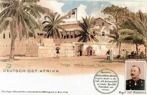 Die Deutsch-Ostafrikanische Gesellschaft (DOAG), der die Entwicklung der Deutschen Kolonie Ostafrika übertragen worden war, und die Anspruch auf die ganze ostafrikanische Küste erhob, musste sich im Spätsommer 1888 angesichts des Widerstands der Küstenbevölkerung unter Buschiri bin Salim auf die Hafenstädte Bagamoyo und Daressalam zurückziehen. Kriegsschiffe beschossen die Küste, richteten aber wenig aus. Die Erhaltung der Kolonie und der Ruf des deutschen Reichs standen auf dem Spiel. Bismarck setzte auf eine Landstreitmacht[2] in Form einer Privatarmee, für deren Aktionen er nicht direkt verantwortlich gemacht werden konnte. Die Truppe brauchte trotzdem staatliche Unterstützung. Damit der Reichstag das Budget dafür bewilligte, begründete Bismarck die Rückeroberung der ostafrikanischen Küste nicht nur mit der „Verteidigung der deutschen Interessen“, sondern insbesondere auch mit der „Bekämpfung des Sklavenhandels“. Damit kam er insbesondere den Zentrums-Abgeordneten entgegen, die sich der christlichen Antisklavereibewegung verpflichtet sahen.[20] Bismarck berief Wissmann zum Reichskommissar und betraute ihn mit der militärischen Niederschlagung. Die Anweisung hieß: „Siegen Sie!“ Bei der Umsetzung hatte er freie Hand.