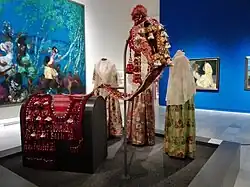 Bei einem Sommeraufenthalt 1904 in Valencia entdeckt Anglada die dort noch erhaltenen farbenfrohen Volkstrachten, die ihren Ursprung im 18. Jahrhundert hatten. Das ändert ab 1905 seine Motive und Maltechnik vollständig[44]. Motive des Pariser Nachtlebens samt der Technik konturloser nebulöser Personendarstellung wurden vollständig aufgegeben zugunsten eine Serie, in der spanisches Landvolk in leuchtend bunten Gewändern bei klarem Licht, ohne Schatten und Perspektive dargestellt ist, im Atelier gestellte decorative Szenen, die nicht Reales abbilden, sondern der Phantasie des Künstlers entsprangen. Dieses Sujet benutzte er als geeigneten Träger eines Feuerwerks von Farben. Als Vorlage legte er sich eine große Sammlung solcher Gewänder zu, mit denen er seine Modelle im Atelier bekleidete[45], wovon einige in der Dauerausstellung im ehemaligen Gran Hotel von Palma zu besichtigen sind.