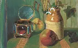 Landschaftsstudien aus Davos, wo sie sich in einem Sanatorium aufhielt, gibt es von Hermine Overbeck-Rohte nicht. Wenn sie malte, dann vermutlich ausnahmslos Stillleben. Der Apfel in Tonschale mag aus dieser Zeit stammen, es zeichnet sich durch eine besonders reduzierte Darstellung und Konzentration auf einen einzelnen Gegenstand aus.