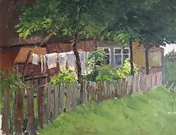 Hermine Overbeck-Rohte bezog auch im Bröckener Haus ein eigenes Atelier. Viel Zeit ihrer Malerei nachzugehen, hatte sie nicht, denn Familie, Haus und der große Gemüsegarten forderten den größten Teil ihrer Aufmerksamkeit. In seltenen Momenten hielt sie ihre Umgebung in Studien fest, so in Unser Hauseingang an einem sonnigen Sommertag. Der Vordergrund ist durch die am rechten Wegrand stehenden Bäume gänzlich verschattet. Sonnenstrahlen scheinen durchs Laub und bilden changierende Lichtflecken und tauchen Teile des Hauseinganges in gleisendes Licht. Dieses auffällige Spiel von Licht und Schatten ist in ihren Worpsweder Studien schon angelegt.