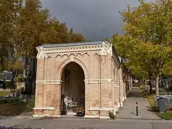 Anschließend an die Aufbahrungshalle wurden hangaufwärts rechtwinkelig neugotische Gruftarkaden errichtet. Die Arkaden sind ebenfalls in Sichtziegelbauweise ausgeführt und beherbergen überwiegend Stelen- oder Obeliskengräber. Teilweise wurde auch klassizistische und frühhistoristische Grabmäler vom alten Hernalser Friedhof weiterverwendet.