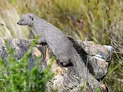 - die Schlankmanguste (Herpestes sanguineus,[2] Syn.: Galerella sanguinea) ist im gesamten Afrika südlich der Sahara (mit Ausnahme von Wüsten und dichten Waldgebieten) verbreitet. Ihr Fellfärbung variiert von rötlich über gelblich bis grau. Die manchmal in den Rang einer Art erhobene Namaqua-Manguste (Herpestes swalius) dürfte nur eine Unterart der Schlankmanguste sein.
