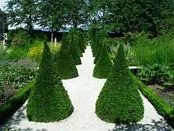 Der Herrengarten hat einen streng geometrischen Aufbau mit sechs Quadraten und einer Allee aus Eiben. Die Wege sind aus weißem Kies.