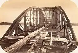 Das 714 m lange Bauwerk bestand über der Stromelbe und Alten Elbe aus fünf Hauptöffnungen mit jeweils 62,8 m Stützweite und im Westen über dem Handelshafen sowie im Osten über dem Vorland aus insgesamt zehn Nebenöffnungen mit 31,4 m Stützweite. Die zweigleisigen Überbauten waren Balkenbrücken mit Stahlfachwerkträgern und untenliegender Fahrbahn und wurden als Schwedlerträger ausgeführt. Es war auf den Ost-West-Verbindungen im Eisenbahnverkehr eine der wichtigsten Brücken über die Elbe. In den 1910er Jahren benutzen bis zu 125 Zugpaare täglich das Bauwerk. Am 18. April 1945 wurde die Brücke durch deutsche Truppen mit Sprengungen stark zerstört. Aber schon am 12. März 1946 konnte das wiederhergestellte Bauwerk nach umfangreichen Baumaßnahmen dem Verkehr übergeben werden.