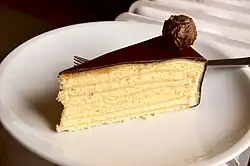 Eine Herrentorte ist eine Torte, die aus mehreren, einzeln gebackenen Wiener Böden besteht[3] und die mit einer Kuvertüre aus Bitterschokolade überzogen wird. Zwischen den Böden ist sie mit Weincreme gefüllt.[4]