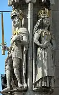 Otto III: (980–1002) starb unverheiratet. Die Identität der Frau an seiner Seite ist ungeklärt. Es wurde vermutet, dass es sich bei der Dargestellten entweder um seine Mutter Theophanu (s. o.) handeln könnte oder um seine Großmutter väterlicherseits Adelheid von Burgund (s. o.). Für Braunschweig wahrscheinlicher erscheint hingegen, dass die Statue Maria von Aragon darstellt, bei der es sich nach einer im Spätmittelalter in Braunschweig verbreiteten Legende, die als historische Wahrheit betrachtet wurde, um die Ehefrau Otto III. handeln solle.[33][34] (Historische) Belege für eine Ehe Otto III. existieren indes nicht. Johann Georg Leuckfeld hatte bereits in seinem 1714 erschienenen Werk Antiquitates Halberstadenses darauf hingewiesen, dass Otto III. nicht verheiratet gewesen war.[35] Auch Carl Schiller hatte 1852 nochmals darauf hingewiesen, dass es sich um angebliche Ehefrau Maria Sophie von Aragonien handeln könne, Otto III. aber unverheiratet war.[36] | |