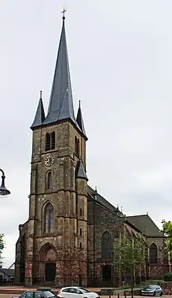 Der Außenbau gliedert sich in den weithin sichtbaren Westturm, das dreischiffige Langhaus, das polygonal abschließende Querhaus mit Nebenchören und den fünfseitigen polygonal abschließenden Chor im Osten.