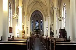 Im Innenraum hat sich ein Großteil der neugotischen Ausstattung aus der zweiten Hälfte des 19. Jahrhunderts erhalten. Dazu zählen der hölzerne Hochaltar im Chor, der 1871 in der Werkstatt von Louis Kocherols in Antwerpen hergestellt wurde, die beiden ebenfalls aus Holz bestehenden Nebenaltäre in den Seitenschiffen, die nach Plänen von Regierungsbaumeister Julius Busch aus Neuss 1886 angefertigt worden sind, ein Beichtstuhl im südlichen Seitenschiff, ein Maria-Hilf-Altar unter der Orgelempore sowie acht Messingleuchten aus der Zeit um 1900 in den Arkaden zu den Seitenschiffen. Erwähnenswert ist auch die Orgel, welche eine Arbeit der Orgelbauwerkstatt von Michael Dautzenberg in Linnich ist und dort 1873 angefertigt worden ist. Die Buntglasfenster sind Werke von Will Völker aus dem Jahr 1964.[3]