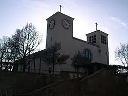 Aus städtebaulichen Gründen steht die Kirche von Norden nach Süden. Sie hat eine breite Fassade mit zwei Türmen, die 22 m hoch und mit jeweils einem 4 m hohen Turmkreuz gekrönt sind. Am Ostturm ist auf drei Seiten je eine Uhr angebracht und im Westturm befinden sich sechs Glocken.