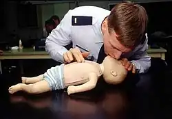 Zur Durchführung der Herzdruckmassage wird bei Kindern nur ein Handballen benutzt. Für Säuglinge verwendet man zwei Finger oder umfasst den Brustkorb mit beiden Händen und drückt ihn (bei Zusammenarbeit von zwei Helfern) mit den Daumen ein. Die Drucktiefe sollte etwa 1/3 des Brustkorbdurchmessers betragen. Die Abfolge nach den fünf initialen Atemhüben beträgt für den Ersthelfer – wie beim Erwachsenen – 30 Herzdruckmassagen zu zwei Beatmungen; für medizinisches Personal gilt ein Druckverhältnis von 15:2, wenn mehrere Helfer anwesend sind. Bei Neugeborenen, die zudem vor Wärmeverlusten geschützt werden müssen, wird ein Verhältnis von 3:1 eingesetzt.[34][35]