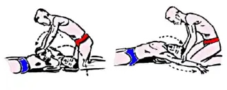 Ist ein Patient mit Fremdkörpern in den Atemwegen noch bei Bewusstsein, wird versucht, diese zunächst durch hustenauslösende, kräftige Schläge zwischen die Schulterblätter, anschließend durch wiederholten Druck auf den Oberbauch (Heimlich-Handgriff) zu entfernen.[8] Vom Heimlich-Handgriff wurde aufgrund der Verletzungsgefahr von Leber und Milz verschiedentlich abgeraten,[15] er ist bei akuter Erstickungsgefahr jedoch das Mittel der Wahl.[16]