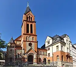 Erbaut wurde die Kirche in den Jahren 1901/02 nach Plänen von Julius Zeißig, die Benediktion war am 28. September 1902. Die feierliche Kirchweihe erfolgte am 10. September 1905. Kirche und Pfarrei wurden unter das Patrozinium des Heiligsten Herzens Jesu gestellt, das in der katholischen Liturgie als Mitte der Schöpfung und Quelle der Sakramente verehrt wird. Die reiche Originalausmalung und die Buntglasfenster wurden im Zweiten Weltkrieg irreparabel beschädigt. Der Bau selbst blieb jedoch unversehrt. In den Nachkriegsjahrzehnten wurden mehrere Renovierungs- und Umgestaltungsmaßnahmen durchgeführt, die von den begrenzten finanziellen Möglichkeiten mitbestimmt waren.