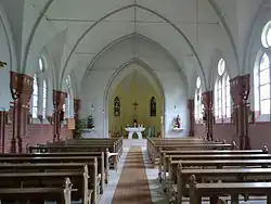 Im Chorraum befinden sich Buntglasfenster aus der Bauzeit, erstellt wurden sie von Hertel und Lerch aus Düsseldorf.[3] Die beiden Fenster zeigen die heiligen Paulus von Tarsus und Simon Petrus.