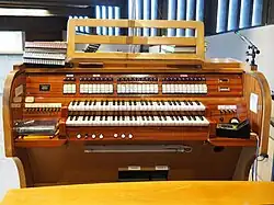 - Spielhilfen: 2 freie Kombinationen, 1 freie Pedalkombination, Tuttiknopf, Crescendowalze, Schwelltritt, Einzelzungenabsteller, Absteller für Crescendo und Koppeln aus Crescendo, Koppel-Pistons