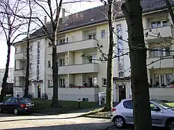 Die nächste Wohnbebauung befindet sich auf der nördlichen Straßenseite unter der Nr. 104, ein Gebäude aus den Anfängen des 20. Jahrhunderts. Kurz daneben steht unter Nummer 106 ein kleines unauffälliges früheres Mietshaus, das nun von einer Tischlerei genutzt wird. Anschließend folgt noch eine Wohnzeile unter den Hausnummern 125–127, die mit dem ehemaligen Verwaltungsgebäude von Elektrokohle eine Straßenfront bildet. Hier lebten anfangs die Arbeiterfamilien der nahe gelegenen Werke, einige Jahre nach 1990 ausländische Einwohner, von etwa 2005 bis 2023 standen die Häuser zum Verkauf.