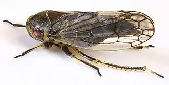 Die Zikaden werden 4,9–5,5 mm lang.[1] Sie sind überwiegend grau-schwarz gefärbt. Die Vorderflügel sind mit deutlichen schwarzen Adern durchzogen. Die Facettenaugen sind rötlich. Die Art weist einen Geschlechtsdimorphismus auf. Der Vorderrand des Pronotums ist bei den Männchen schwarz-gelb gefleckt. Das Gesicht der Männchen ist gelb gefärbt und weist im oberen Bereich eine schwarze Strichzeichnung auf. Das Gesicht der Weibchen ist dagegen bräunlich gefärbt und weist einen herzförmigen dunklen Fleck im unteren Bereich auf.[2] Das Scutellum (Schildchen) der Männchen ist dunkel mit zwei gelben Flecken an der Seite, während das der Weibchen überwiegend braun gefärbt ist.[2]