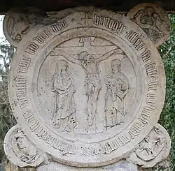 Auf der Vorderseite des Steins findet sich auf einer großen runden Medaillonscheibe eine Kreuzigungsgruppe mit Jesus, Maria und Johannes. Der obere Umlauf trägt die Inschrift: