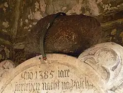 Auf der Rückseite des Steins ist im unteren Bereich eine kniende und betende Gestalt im langen Mantel mit Pelerine dargestellt. Von ihren Händen steigt ein – heute kaum noch sichtbares – Spruchband auf mit den Worten MISERERE MEI DEVS – „Erbarme dich meiner, Gott“ (Ps 50,3 /Ps 51,3 ). Dabei könnte es sich um eine Gefolgsperson von Herzog Albrecht oder seine Witwe Katharina handeln, oder um den Herzog selbst, der einmal in Rüstung und einmal in Zivil dargestellt ist. Auf dem Kreuzstein ist oben ein Findling mit einem Metallband befestigt, bei dem es sich um das Blidengeschoss handeln soll, von dem der Herzog getroffen wurde.
