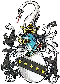 Blasonierung: In Silber ein schwarzer rechtsschräger Balken mit fünf goldenen Kugeln belegt. Auf dem gekrönten Helm mit schwarz-silbernen Helmdecken ein silberner Schwanenkopf mit Hals.[4]