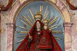 Die Marienstatue trägt eine Krone und ein Zepter und auf dem Arm das Jesuskind, das ebenso gekrönt ist und den Reichsapfel trägt. Beide sind in purpurfarbene mit Gold und Silber bestickte Gewänder gekleidet. Maria wird also als Himmelskönigin dargestellt, weshalb sie auch über einer abnehmenden Mondsichel steht. Außerdem wird sie als Schutzmantelmadonna gezeigt.[10]