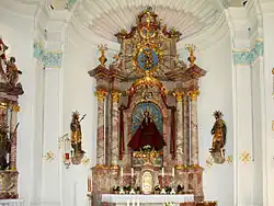 Auf dem Retabel steht unter einem Baldachin das Gnadenbild in einer Nische über dem Tabernakel[10]. Flankiert wird es links und rechts jeweils von Doppelsäulen, dem Hoheitsmotiv der Sakralarchitektur[9]. Die Dreifaltigkeit zeigt sich mit Gott Vater im Altarauszug, Jesus auf dem Arm Marias und darüber im Baldachin dem Heiligen Geist. Im Auszug befindet sich ebenfalls das Doppelwappen des Klosters Wessobrunn und des Errichters des Hochaltars, Abt Joseph Leonardi von Wessobrunn.[10]