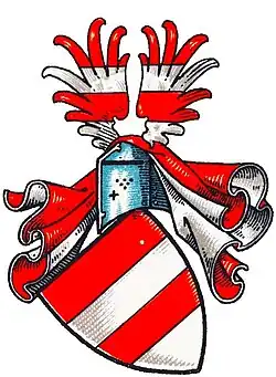Blasonierung: Dreimal von Rot und Silber geteilt. Auf dem Helm mit rot-silbernen Helmdecken ein offener Flug bezeichnet wie der Schild.[1]