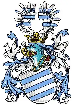 - Blasonierung des Stammwappens: In Blau drei silberne Balken, auf dem Helm mit blau-silbernen Decken ein mit je drei silbernen Balken belegter offener Flug.