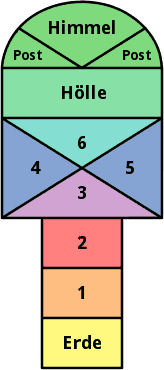 In einer Variante ist das erste Feld mit dem Wort „Erde“ bezeichnet, das vorletzte mit „Hölle“ und das letzte mit dem Begriff „Himmel“. Meist ist die Erde das Startfeld. Die Hölle ist grundsätzlich zu überspringen, das heißt, sie darf nicht betreten werden. In einigen Varianten gibt es Postfelder, landet der Stein hier, darf ab nun nicht mehr gesprochen oder gelacht werden, was die Mitspieler natürlich umso mehr reizt, den Teilnehmer dazu zu veranlassen.