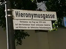 - ↑ In Konstanz in der Hussenstraße 14 befindet sich das Haus zum Delphin. Plaque zur Erinnerung an Hieronymus von Prag.